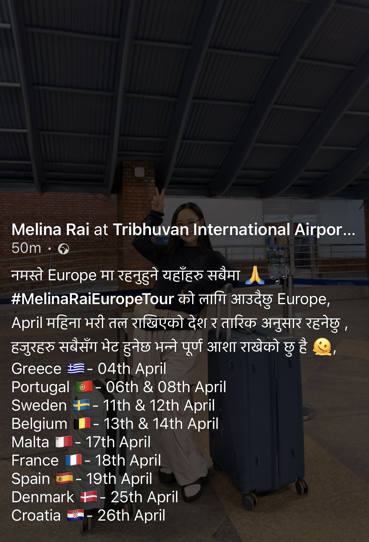 युरोप । नेपाली नयाँ वर्षका अवसरमा साङ्गितिक टुर लिएर गायिका मेलिना राई यतिखेर युरोपमा छिन् । राईले अप्रिल महिनाभरी युरोपका बिभिन्न देशमा सांगितिक प्रस्तुती दिँदै छिन् ।