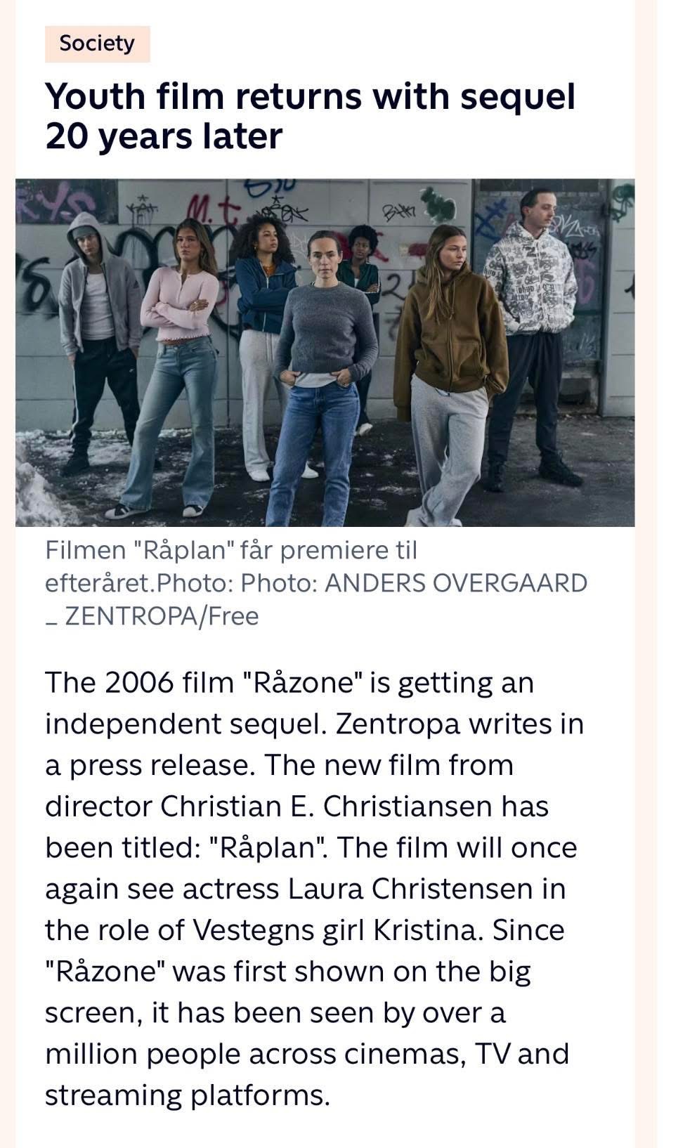 सन् २००६ मा निर्मित तथा प्रदर्शित क्रिस्टियन ई. क्रिस्टियन्सन निर्देशित युवा चलचित्र Råzone को सिक्वेल चलचित्र Råplan यही आउँदो October 8 तारिखमा डेनमार्कका सिनेमा हलहरूमा रिलिज हुँदैछ । पुरानै निर्देशक र प्रायः पुरानै कलाकारहरू अनुबन्धित ‘रोप्लान’ जेन्ट्रोपा इन्टरटेन्मेण्ट्सको निर्माणमा बनेको चलचित्र हो ।